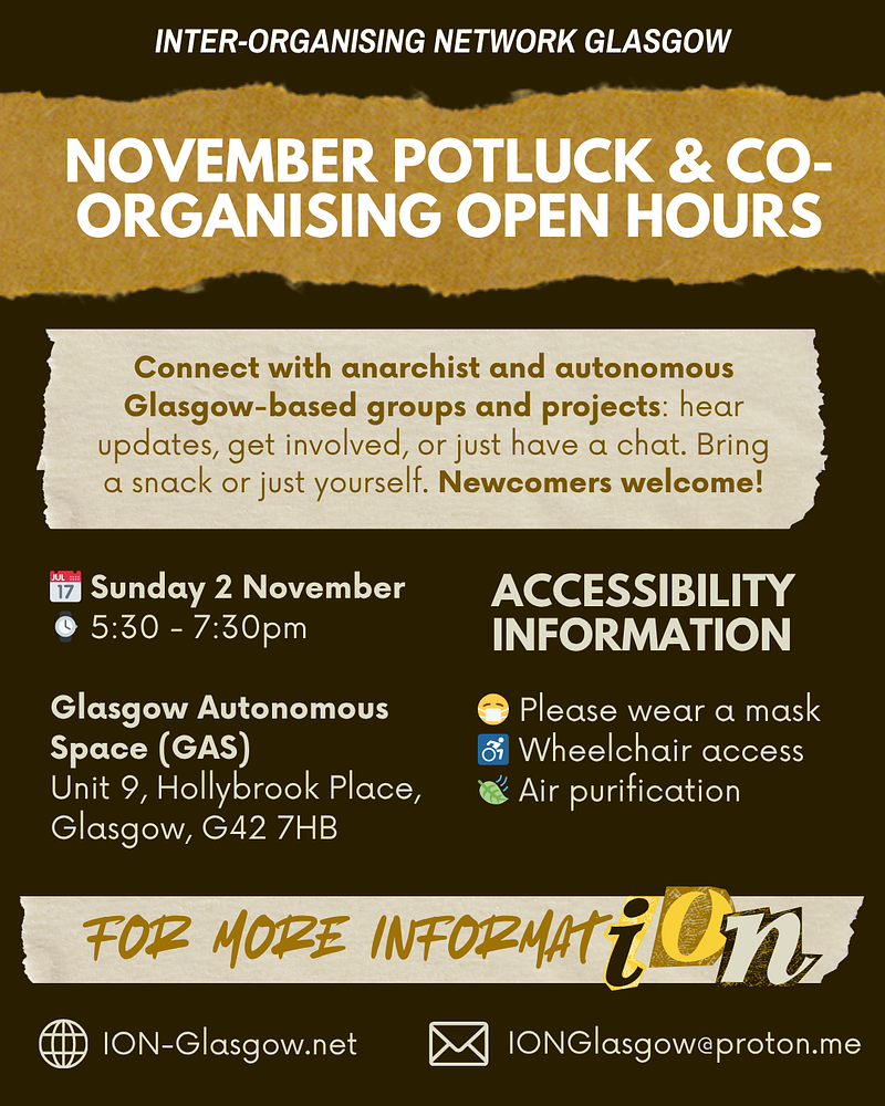 Connect with anarchist and autonomous Glasgow-based groups and projects: hear updates, get involved, or just have a chat. Bring a snack or just yourself. Newcomers welcome!