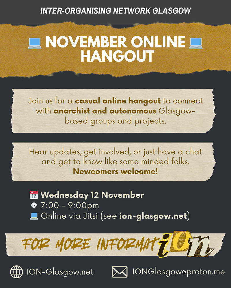 Join us for a casual online hangout to connect with anarchist and autonomous Glasgow-based groups and projects.